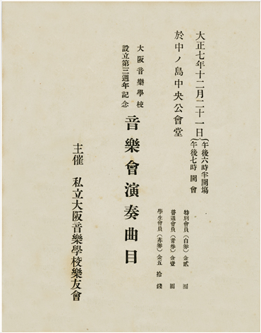 中之島に完成したばかりの大阪市中央公会堂にて、本学生徒・教員による創立3周年を祝う音楽会が開催された。これが、中央公会堂における初めての音楽会となった