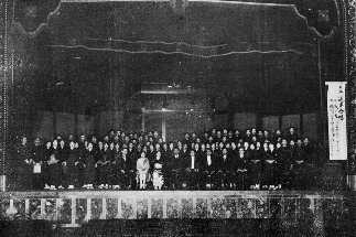 | コーラス・コンテストに参加した団体とメンバーたち 東京音楽学校卒業生同声会主催「西洋音楽渡来50周年記念音楽会」の第一部で、在阪8つの合唱団によるコンテストが行われ、総勢300名あまりが参加した。このときのプログラムには8つの団体の参加者名も記載されている。参加者たちの子孫にとって貴重な記録であろう。 また、この年の11月には関西各大学専門学校合唱団体による合唱連盟が結成された。加盟したのは、このコンテストにも参加していた大阪商科大学グリークラブや関西学院グリークラブをはじめ10団体で、約300名の部員が在籍していた。 翌1931年(昭和6年)1月16日に朝日会館で行われた第1回音楽会では、当時合唱の指揮者として活躍していた本学教授の長井斉が指揮をしている。 |