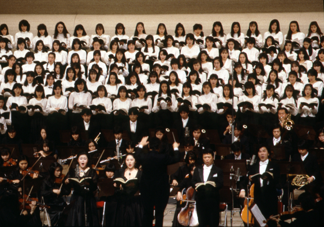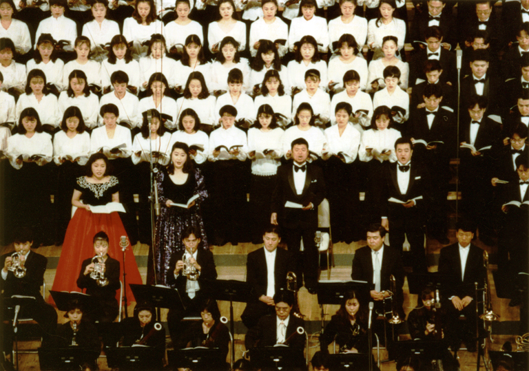 在学生・卒業生・教職員・ザ・カレッジ・オペラハウス合唱団有志による総勢300名の創立80周年記念合唱団は、6月から練習を重ねた。138名の創立80周年記念管弦楽団とともに、マエストロ岩城宏之の指揮の下、満員のフェスティバルホールで歓喜の歌を響かせた。