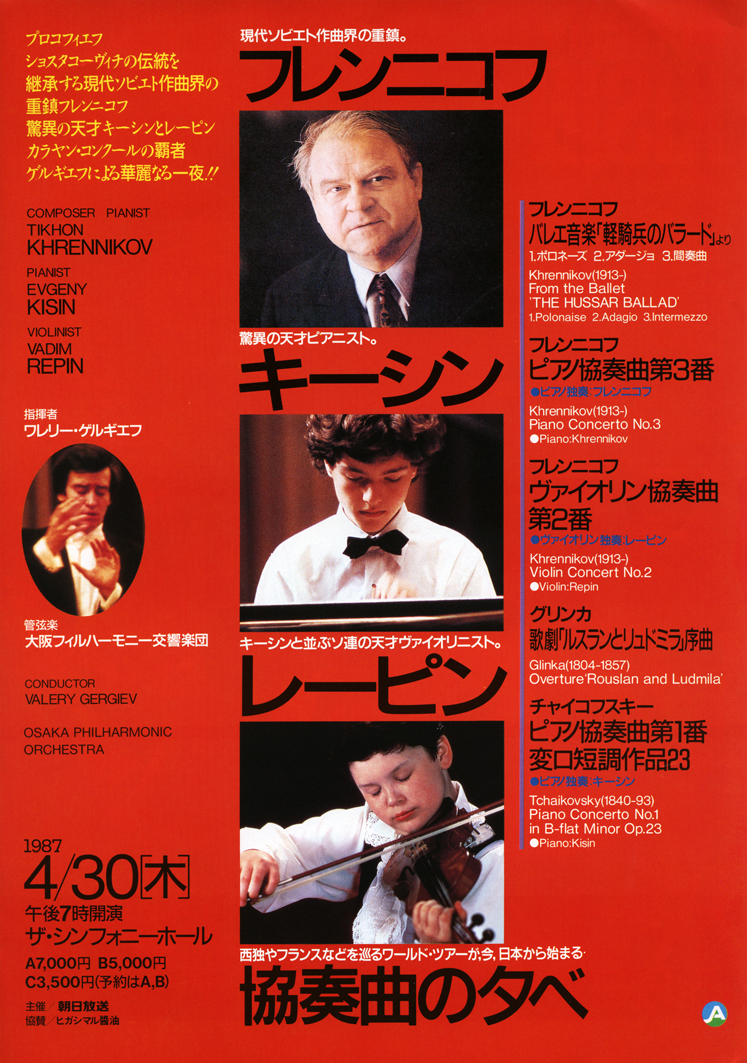 | 1980年代半ばの神童ブーム 1981年(昭和56年)に18歳で初来日したヴァイオリンのアンネ=ゾフィー・ムターが天才少女として注目を集めて以来、1980年代半ばには様々なティーンエイジャーの演奏家が相次いで来日し、クラシック音楽界において神童ブームと呼ばれる現象が沸き起こることとなった。その嚆矢となったのは、1984年(昭和59年)に14歳にして初来日したギリシャのピアニスト、ディミトリス・スグロス。10歳でアテネ国立音楽院の教授資格を与えられたという驚異的な神童ぶりであった。「14歳。まだ初恋も知らないのに・・・」という来日公演のキャッチコピーは、その若さを商業的に巧みに表現していよう。同じくピアニストでは、1986年(昭和61年)にエフゲニー・キーシンが15歳にしてソ連から初来日。同年のチャイコフスキー国際コンクールのオープニング・コンサートに出演して一大センセーションを巻き起こし、その卓越したテクニックを日本でも披露し大いに話題となった。この後、ベネズエラのセルジオ・ダニエル・ティエンポ(1988年に16歳で初来日)といったピアニストの他、ヴァイオリニストでは五嶋みどり(1982年に渡米、1985年に14歳で日本デビュー)、ヴァディム・レーピン(1987年に15歳で初来日)やマキシム・ヴェンゲーロフ(1988年に13歳で初来日)など、早期天才教育を受けたソ連勢を中心として様々な国の若きヴィルトゥオーゾたちが彗星の如く現れた。 彼らは来日を重ねつつ日本国内におけるクラシック音楽市場に参入し、名のある巨匠や中堅演奏家たちとは異なった、爽やかかつ鮮烈な演奏で大衆性を獲得してゆくこととなる。これは恐らく、戦前より教養主義的な志向をもって聴取さてれてきたクラシック音楽が、戦後から高度経済成長期・安定成長期にかけての社会的な価値観の変化の中で、一般大衆にも親しみやすく気軽に楽しめるものとして幅広いポピュラリティーを有し始めたということと大きな関係があろう。第11回ショパン国際ピアノコンクールで優勝、国内で熱狂的な「ブーニン現象」を巻き起こしたスタニスラフ・ブーニンも、1986年(昭和61年)7月の初来日時は19歳のティーンエイジャーだった。特に若い女性の間で顕著であったブーニンの絶大なアイドル的人気も、ある意味、1980年代半ばの神童ブームの一端であったと見做すことができよう。 |