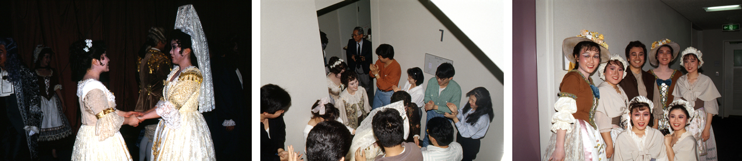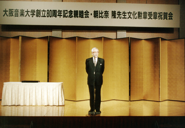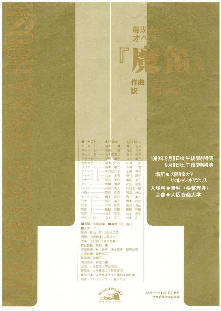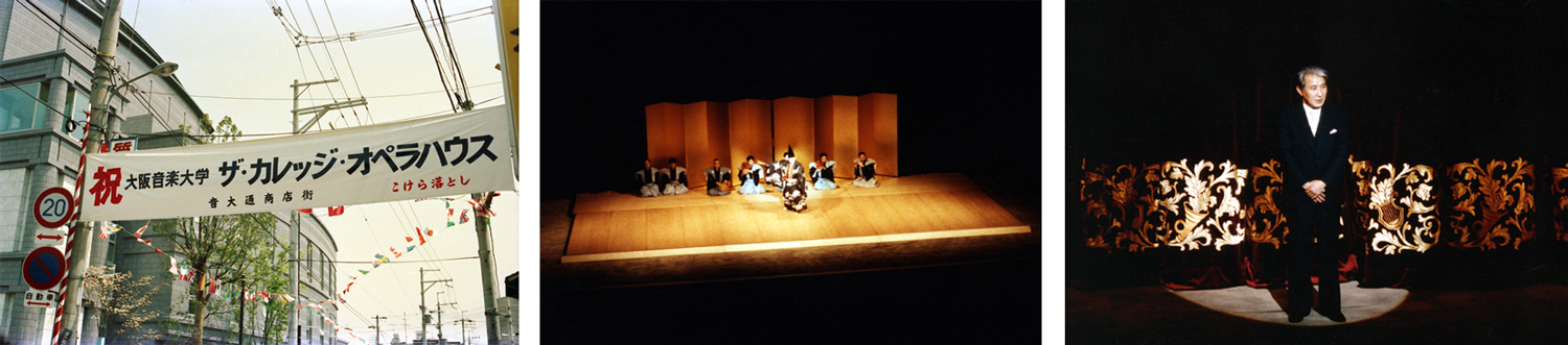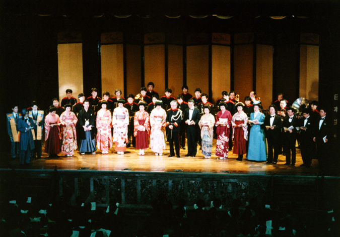 | 創立80年の実り 1995年(平成7年)は本学にとって創立80周年という記念すべき年であったが、同時に壮絶な大震災に見舞われ、オウム真理教による地下鉄サリン事件が起きるなど、日本中が忘れることのできない特別な年になっていた。震災からいち早く立ち直った本学ではあったが、創立80周年記念公演は、田中理事長いわく「華美なものに流れず、あくまでも着実なものをめざして」行われた。 フェスタ70からの10年間は、オペラハウスという創立者永井幸次が願った一大音楽堂の完成、その専属オーケストラ・合唱団の発足、入試改革、カリキュラム刷新など、さらなる発展を願って急速に変化を遂げた転換期であった。それらによる成果を披露すべく8つの公演を開催した。スタートを切ったのはオペラハウスの開館とともに復活した選抜学生によるオペラで、記念公演として選んだのは、多数の出演者を擁するモーツァルト《魔笛》。総勢35名のダブル・キャスト(うち3名は教員らの助演)、合唱46名、管弦楽団51名、マネージャー・舞台補助・演出補助などの裏方13名が総力を挙げて上演した。 音楽文化史研究室が企画した「永井幸次の軌跡─メモリアル・コンサート」では永井が残した1,000曲余りの作品の中から10数曲を選んで演奏し、西岡信雄音楽研究所所長の解説により、その生涯を振り返った。オペラハウス合唱団が男性は詰襟学生服、女性は紋付に緑袴という大阪音楽学校当時の正装に身を包んで出演。付属音楽幼稚園児たちも遊戯つきの唱歌を披露した。会場のオペラハウスロビーには永井の自筆譜や出版楽譜・教科書などゆかりの品々、写真など300数十点を展示し、“関西音楽界の父”といわれたその足跡を偲んだ。永井は80歳を機に、自伝『来し方八十年』を著したが、本学の80歳を記念してのこの公演は、創立者を顕彰するとともに、本学の来し方80年を回顧するものでもあった。 ザ・カレッジ・オペラハウス管弦楽団は第14回定期演奏会に世界的ヴァーグナー歌手として知られるテオ・アダムを迎え、ドレスデン音楽大学のアレクサンダー・フォン・ブリュック教授の指揮の下、ヴァーグナー作品に初挑戦した(大阪文化祭参加公演)。創立記念日となる10月15日にはフェスティバルホールにおいて、第38回定期演奏会を開催。田中邦彦教員による創立80周年記念委嘱作品《“KRISTALLENE STUNDE”祝典的作品「透明な時」》と、大震災への哀悼と新生への決意を込めてベートーヴェン《第九》を演奏した。出演は在学生、教員、ザ・カレッジ・オペラハウス管弦楽団有志による創立80周年記念管弦楽団(コンサート・マスター:宗倫匡教員)と在学生、卒業生、教職員、ザ・カレッジ・オペラハウス合唱団有志による同合唱団。指揮者には6月のオペラハウス管弦楽団の定期演奏会に続き、再び岩城宏之を迎え、ソリストは本学教員・卒業生が務めた。 記念公演の最後を飾ったのは、創立80周年記念オペラとして近藤圭教員に台本・作曲を委嘱した《出雲の阿国─芸能者の生涯─》。日本オペラ・シリーズIIIとして上演し、ザ・カレッジ・オペラハウス管弦楽団常任指揮者の飯森範親が就任後初めてオペラ公演のタクトを振った。出演は本学卒業生及び教員で、3役がダブル・キャスト。主役の阿国を演じた一人、川中恵子はオペラハウス合唱団からの抜擢であった。歌舞伎の創始者といわれる出雲の阿国の生涯を描いた有吉佐和子の長編小説を題材に、3時間半に及ぶ大作がオペラハウスの創作オペラ第1号として生み出された(大阪文化祭参加公演)。 本学がオペラを創ったのは、1964年(昭和39年)11月の石川・富山・岐阜演奏旅行の際、狂言『釣針』をもとに文学の教員であった田中理事長が台本を書き、同じく近藤が作曲した《賤のおだまき》以来であった(年表参照)。近藤は本学に勤めて約40年、創立者永井の遺した建学の精神を本学の教師として、作曲家としての努力目標としていたという。その近藤の西洋音楽と日本の伝統音楽が結合したオペラにより、30年前にはなかった自前のオペラハウスで、その専属のオーケストラ・合唱団を得て、本学はまさにその目標とする「新音楽 新歌劇の発生地」たる姿を見せて、創立80周年記念公演の幕を閉じることができたのである。 |