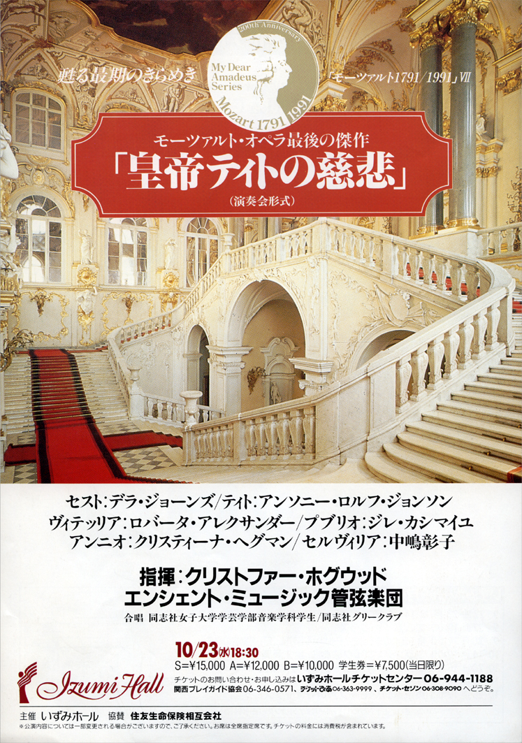 | 1995年 ザ・カレッジ・オペラハウス主催公演 年表に掲出のザ・カレッジ・オペラハウス管弦楽団特別演奏会、プッチーニ・オペラ・シリーズI《蝶々夫人》、ザ・カレッジ・オペラハウス合唱団特別演奏会、日本オペラ・シリーズIII《出雲の阿国》以外の公演は以下のとおり。この年のザ・カレッジ・オペラハウス主催公演は、震災の影響により2月開催予定であったコンサート・オペラ・シリーズII《オルフェオとエウリディーチェ》が中止となり、全10件であった。 |