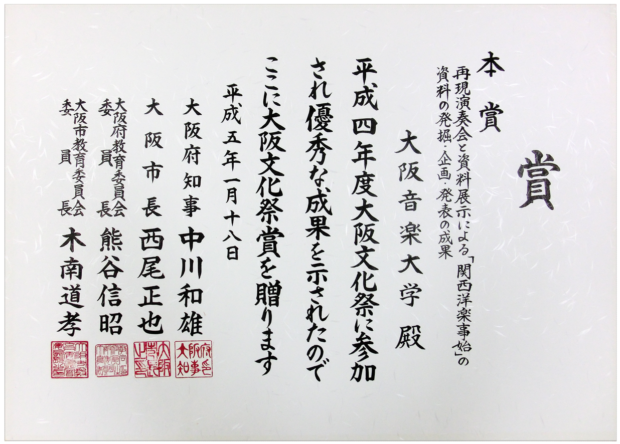 大阪府立文化情報センターとの共催により、同センターにおいて5~6月の数夜にわたり、実演を交えた公開講座を行うこととなった。学外における講座開催は本学初。聴講は無料、各日事前申し込みによる先着200名であった。2010年度まで継続