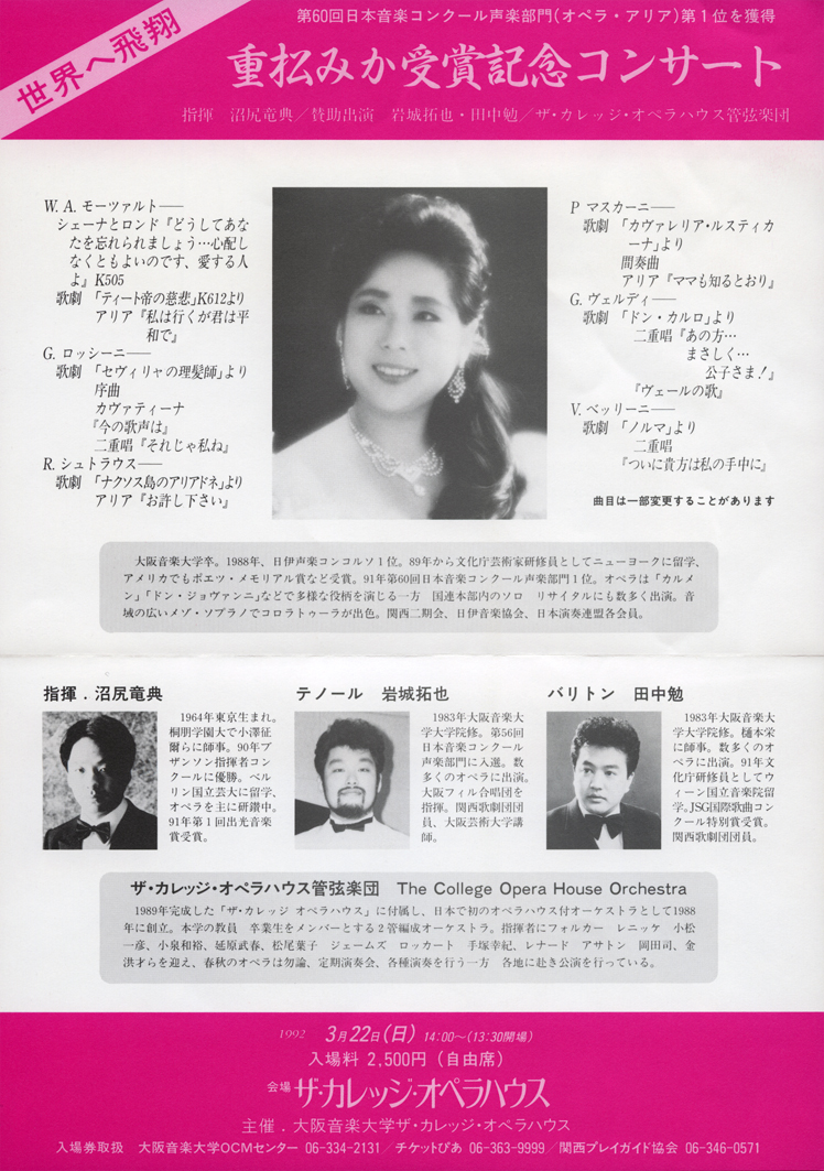 かつて創作オペラの隆盛を誇った関西のオペラ界の伝統を、現代に受け継がんとする意欲的な上演であった。同月には、関西歌劇団によるモニュシュコのオペラ《ハルカ》の関西初演(アルカイックホール)、一柳慧のモノ・オペラ《火の遺言》の関西初演(いずみホール)といった、話題のオペラ公演も相次いだ