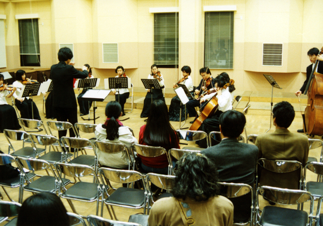 | 「フェスタ70」から「演奏週間」へ 前年の創立70周年記念事業「フェスタ70」は、学生、教職員が一つの目標に向かって一体となって進んだ結果、大学全体の活性化を促す大きなエネルギーとなった。この成果を受け、さらなる教育内容の充実に向けて、そのエネルギーを持続させようと、「演奏週間」という特別な期間を設定することになった。「フェスタ70」と同じく、期間中は平常の授業に代えて演奏会・特別講義を集中的に開催。全学生が何らかの催しに参加することを基本に、それに向けて練習・研究を重ね、必修以外の特別講義にも専攻の枠を越えて受講できる機会を提供した。学生たちのさらなる飛躍への契機となることを期待するものであった。 またこの演奏週間は、学生や教員たちに音楽的刺激を与えると同時に、学外に向けて本学の日頃の成果を広く発表する場であり、開かれた大学の事業の一環としても、全ての演奏会・特別講義について座席に余裕のある限り、事前の申し込みによって整理券を発行し、一般に無料で公開した。 演奏週間は1996年度から「演奏月間」と改称し、2001年度まで毎年秋に開催を続ける。 |