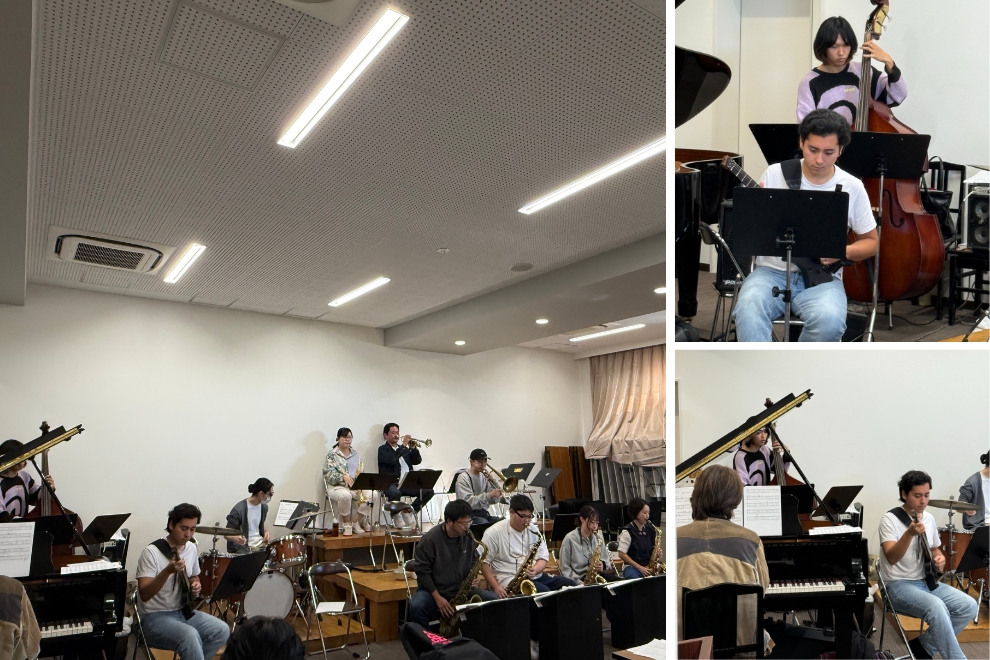 大音では作曲デザインコースを専攻していますが、ジャズピアノ・ダブルベースの理論と演奏、伝統音楽(雅楽・三味線)も履修しています。授業数が多く忙しい毎日ですが、交換留学生としてこれほど多様な機会を提供してもらえる環境はとても恵まれていると感じています。履修している多くの授業はまったく新しい内容か、母校とは異なるアプローチで学べるもので、どの授業も新たな経験を与えてくれています。特に雅楽や日本の伝統楽器について学ぶ授業は、日本に留学しなければ絶対に経験できなかったことです。