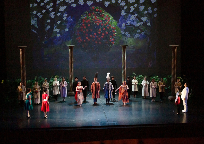 文化庁芸術祭大賞など数々の賞を受賞している「ザ・カレッジ・オペラハウス」の公演にも、多くの卒業生がプロの歌手として、ソリストや合唱団で出演し続けています(2019年度オペラ公演「カプレーティとモンテッキ」より)