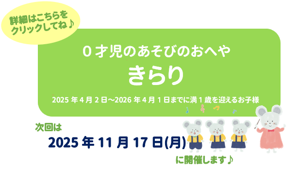 | 2025年10月20日 NEW 【11月回】0歳児イベント「きらり」 募集中です♪ |