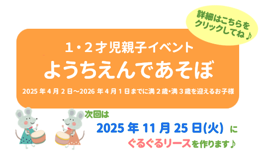 | 2025年10月27日 NEW 【11月回】1・2歳児イベント「ようちえんであそぼ」 募集中です♪ |