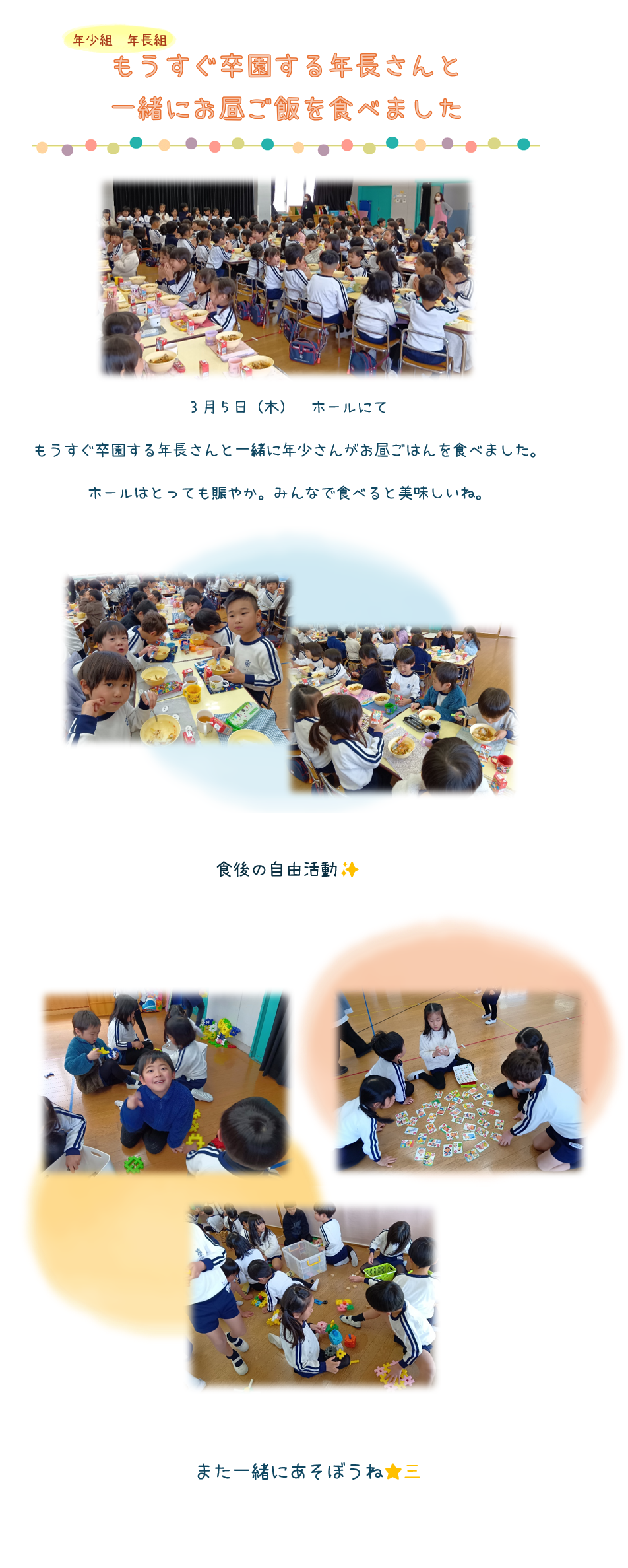 TOP >  日々のできごと >  2025年度「日々のできごと」 >  【年少・年長】ホールでお昼ご飯を食べたよ