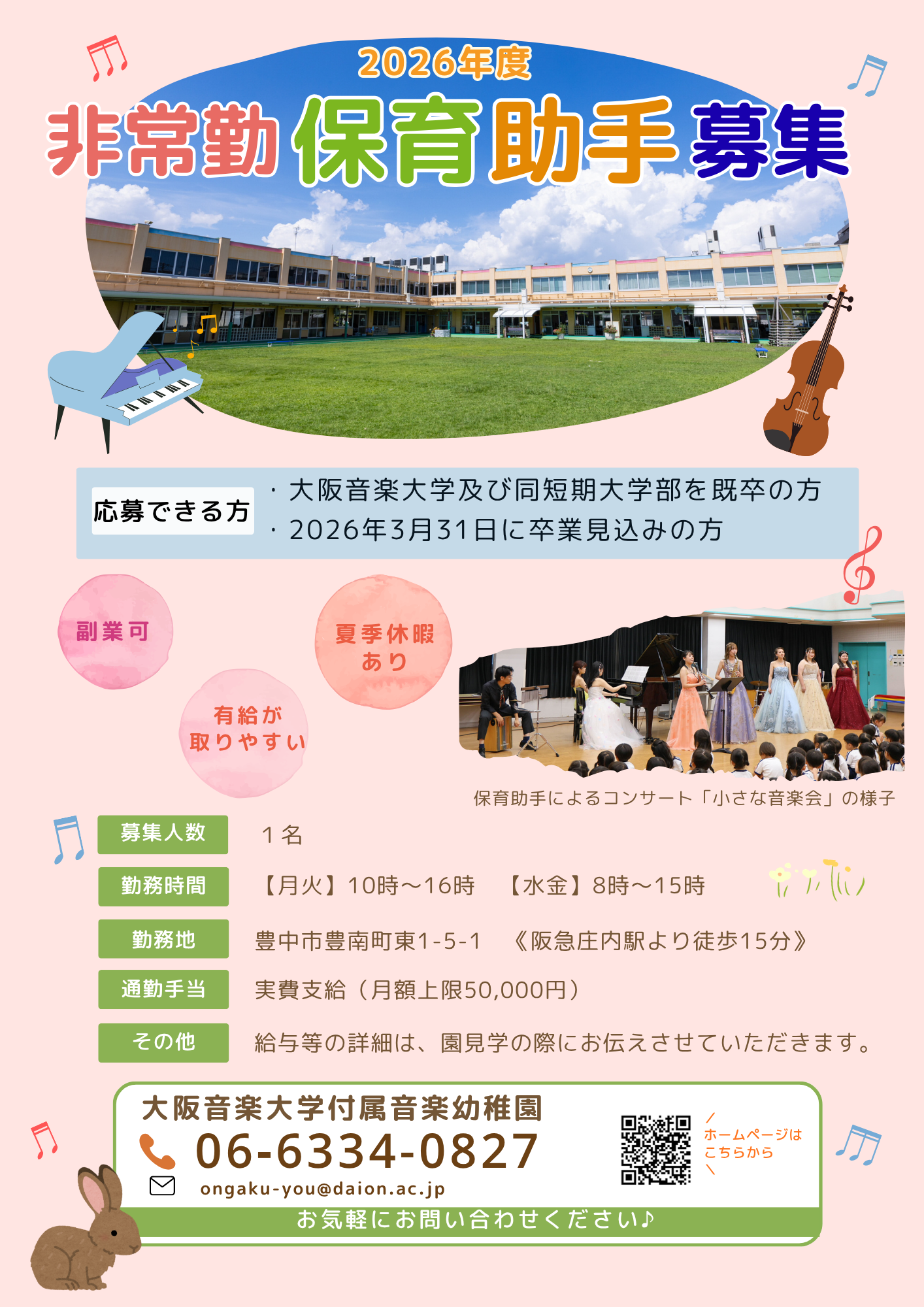 採用情報 担任・副担任 2025年4月1日採用・・・採用決定いたしました。 非常勤保育助手♪ 大阪音楽大学・大阪音楽短期大学を卒業した方で保育助手としてお仕事してくださる方を募集しております。 見学も受け付けておりますのでお問い合わせください。