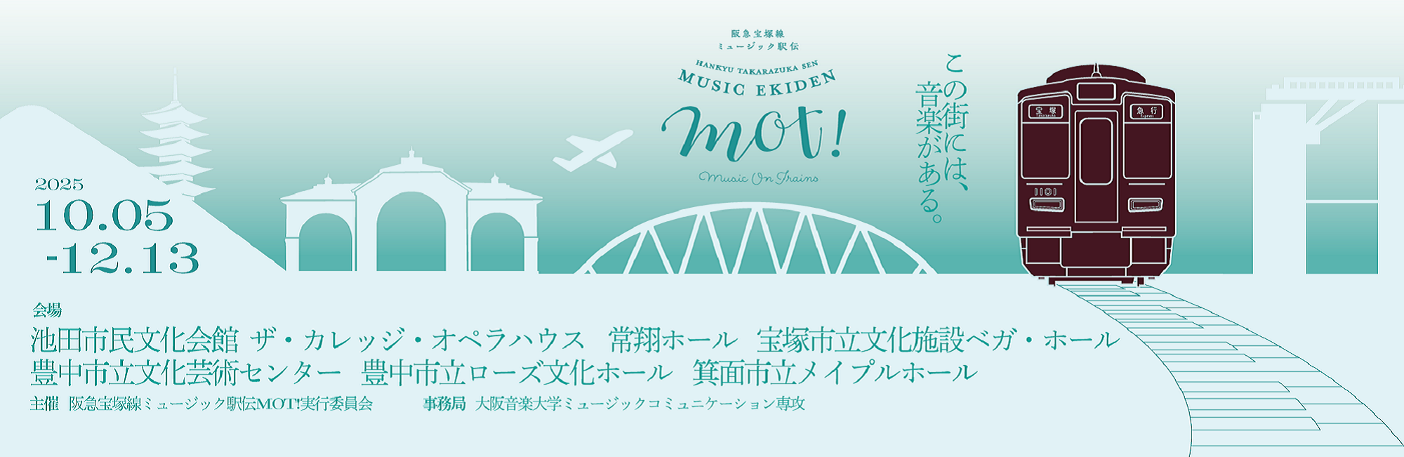 「阪急宝塚線ミュージック駅伝MOT!」は、阪急宝塚線沿線に点在している複数のホールや大学の施設が連携し、音楽を軸とした場をリレー形式で「駅伝」のようにつなぎ、沿線の音楽文化の魅力を創出することを目的としたプロジェクトです。2025年10月5日(日)から12月13日(土)の期間中、参加各ホールが主催する公演と、その間をつなぐフリンジイベントで、阪急宝塚線沿線の音楽文化を盛り上げます。