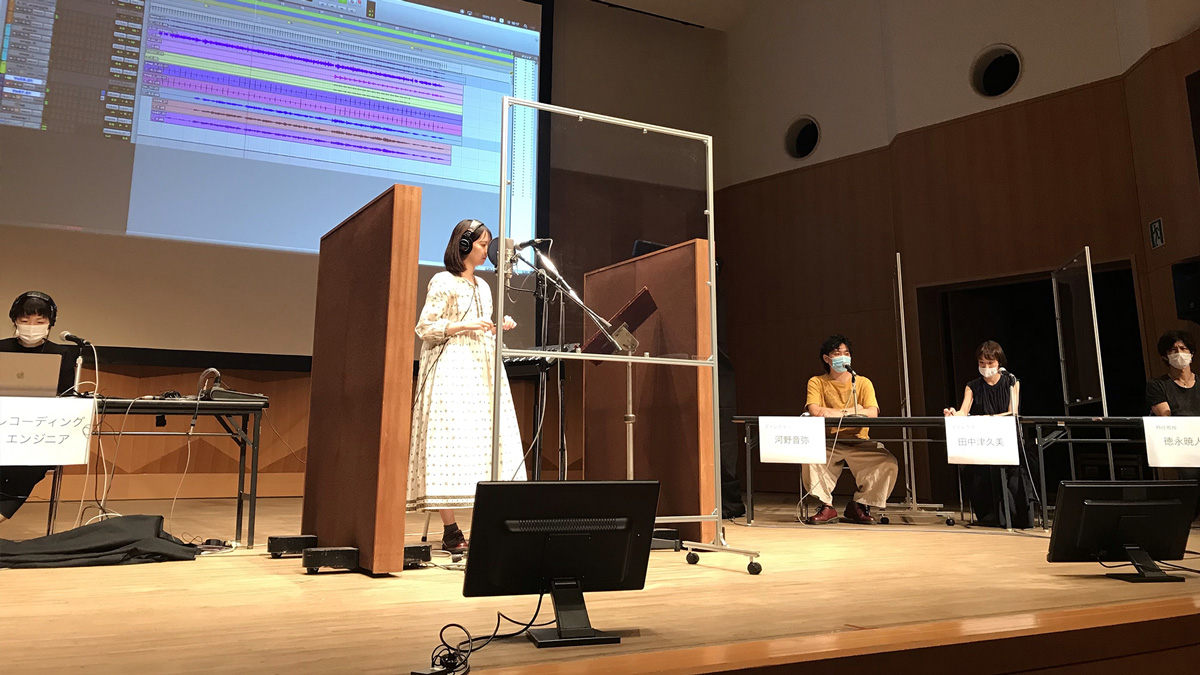イベント後半では、4年生の樫内日南子さんのオリジナル楽曲をレコーディング。樫内さんにはボーカル役を、4年生の田中津久美さん・河野音弥さんにはディレクター役を演じてもらい、徳永暁人特任教授がその場で指導。歌い手へのディレクションの仕方やスピード感など、プロ目線で指導いただき、ディレクションの大切さを学べる貴重な機会となりました。また、録音した歌をエンジニアがその場で編集するなど、プロの現場ならではの光景も数多く見られました。