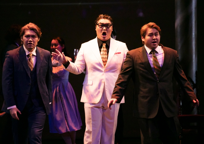オーボエ・ソロの伸びやかな旋律から始まる序曲から舞台の幕が開くと、そこはプリズム光線がまばゆい現代の“クラブ”のような空間(演出ノートによるとバーレスクでのバチェラー・パーティーとのこと)。そこではフェランド(Ⅰ幕 山澤奏仁〈大学3年〉・Ⅱ幕 野勢真稔〈大学4年〉)とグリエルモ(出演者体調不良による降板のため全幕 仲田尋一〈演奏員〉)とドン・アルフォンソ(島羽槻〈大学3年〉)の男3人による「女は浮気をするか?」という他愛もない、しかし全時代的に通用する話題で盛り上がっている。やがてフェランドとグリエルモはお互いの恋人を賭けの対象にしてしまう。三重唱はそれぞれのキャラクターが見えつつ、今後の物語の行方も暗示させる楽しい時間だった。なおこの場面では、田中勉・田中由也の両教授が給仕としてカメオ出演しており、それに気づいた客席からは忍び笑いがこぼれていた。