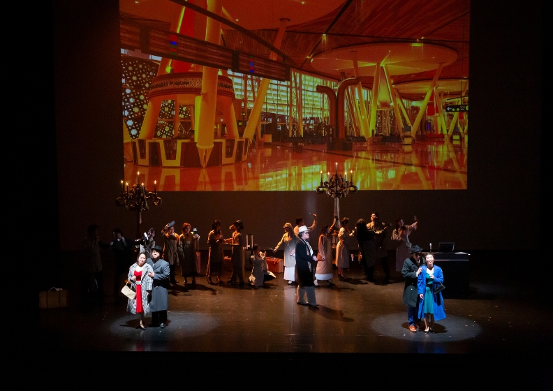続く場面はダ・ポンテの台本だと、フェランドとグリエルモが軍隊生活へ行くと嘘をついて旅立ってしまうという筋書き。今回は設定を現代に置き換えて、世界を飛び回るビジネスマンの急な出張として空港から出立するという見事な翻案だった。声楽専攻の学生によるビジネスマンたちの合唱は、元を知っているとなおさら見ていて可笑しい。空港の発着案内板などという通常のオペラではあまり考えられない大道具も、もはや大阪音大のオペラではお馴染みとなった久保田テツ(ミュージックコミュニケーション専攻元教員)による映像がいかんなくその効果を発揮していた。
