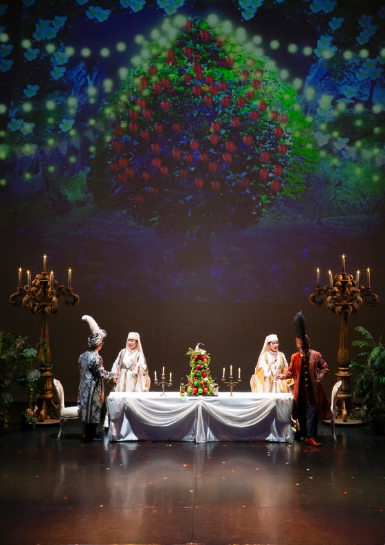 ドン・アルフォンソがオーナーを務めるホテル・ラウンジに場を移すと、バー・カウンターには山盛りのリンゴ。この後の「エデンの園」公園の場面でも鈴生りのリンゴの樹が象徴的に登場するが、これは不倫を“禁断の果実”として見立てたものであろう。バーテンのデスピーナ(𠮷田薫穂〈大学4年〉)は姉妹にリンゴとともに不道徳な行ないを勧める。