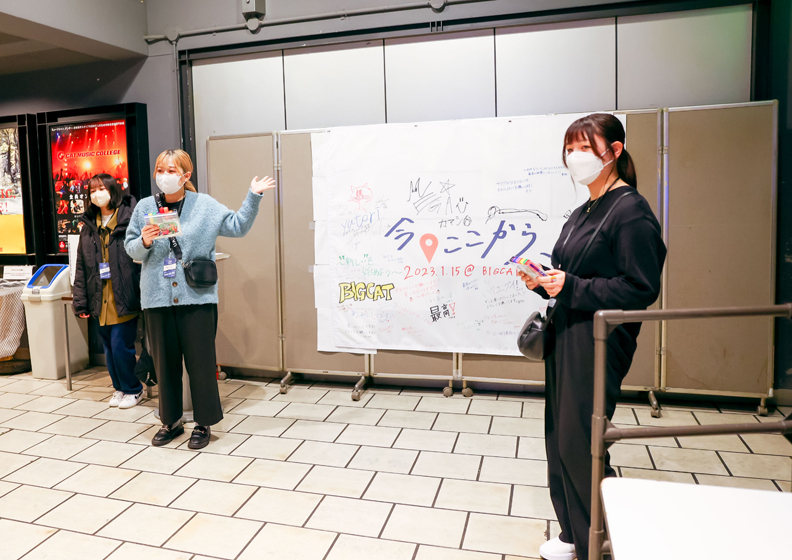 開場時間が迫り、場外の整備、票券管理(来場者数の把握や入場対応などの確認)、ロビーの設営に急ピッチで取りかかります。イマココフラッグには、アーティストのサインやメッセージも入り、飾るとロビーがパッと華やかに。