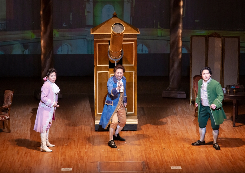 マエストロ・粟辻聡のバトンを使わないしなやかな指揮による序曲で幕が開くと、望遠鏡が鎮座するなにやら研究所のような施設でのエックリーティコ(清原邦仁)とその弟子たちによる合唱(声楽専攻生)。貴族社会の出立ちながらも、歌詞には「望遠鏡だか顕微鏡だかわからないが……」といったものがあり、発展途上にある同時代の科学技術を窺い知ることができて興味深かった。エックリーティコはブォナフェーデ(桝貴志)に月の世界を見せると言って望遠鏡を覗かせるが、その実は研究所内で弟子たちが演じているだけ。そんなことは露知らず、ブォナフェーデは満足したお礼に金を渡して去っていく。詐欺師とスケベ親父というどちらもアクの強いキャラクターだったが、最後までどこか憎めなかったのは演じ方のおかげだろうか。