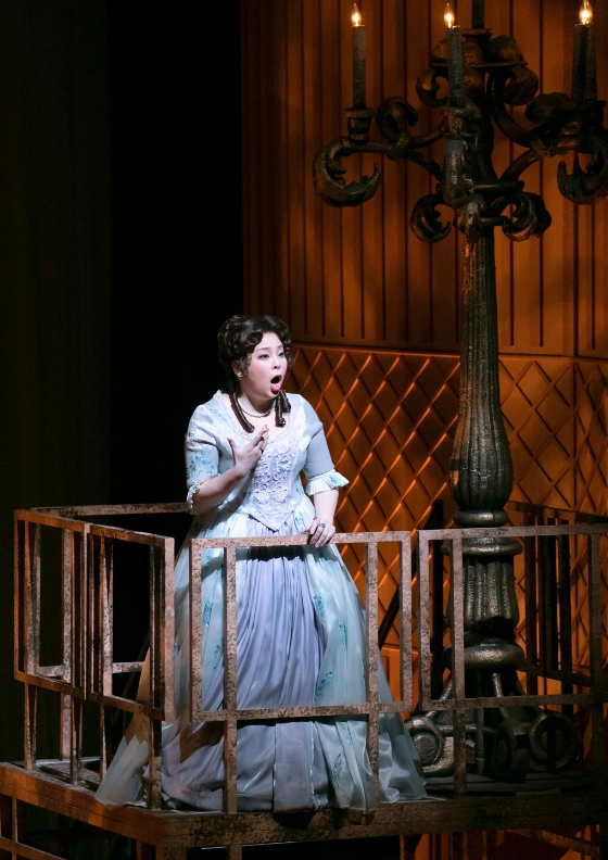 エルネストとチェッコが客席(宝塚歌劇でいうところの“銀橋”)を使ってアリアを歌う間に、舞台は第1場のエックリーティコの研究所から第2場のブォナフェーデ家へシームレスに転換。ズボン役の大賀によるのびやかなアルトや、道化役・チェッコの「望遠鏡は見えても、自分のことは見えていない」と皮肉る歌唱は、単なる場繋ぎではなく見ていて飽きさせない。